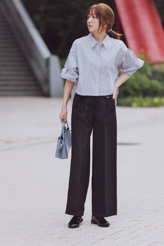 知的ムードなストライプシャツで、クライアント先へ新規案件の提案に。
