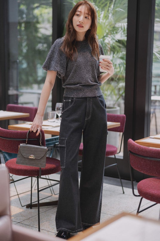 週末はカフェで一人時間を満喫。ボリューム袖のニットでラフなデニムルックに着映え感をON。
