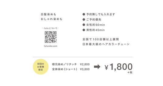 fufuを初めてご利用いただく方全員に、根元染め(リタッチ)税込3,080円&全体染め(ショート)税込4,180円を、税込1,980円でご提供いたします。