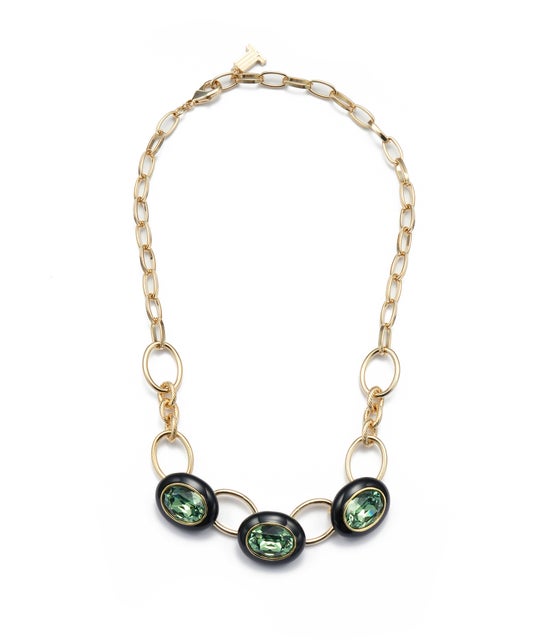 ブラック×ゴールドにグリーンとレッドを効かせた配色が秋の装いのアクセントに。