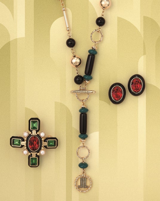 幾何学的なデザインをコスチュームジュエリーならではのボリュームと素材の組み合わせで表現し、モダンかつエレガントに仕上げました。
