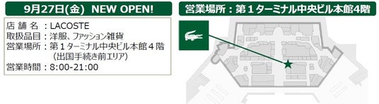 2024年9月27日(金)、第1ターミナル中央ビル本館4階(出国手続き前エリア)に、フランスのプレミアムファッションスポーツブランド「LACOSTE」がオープンします!