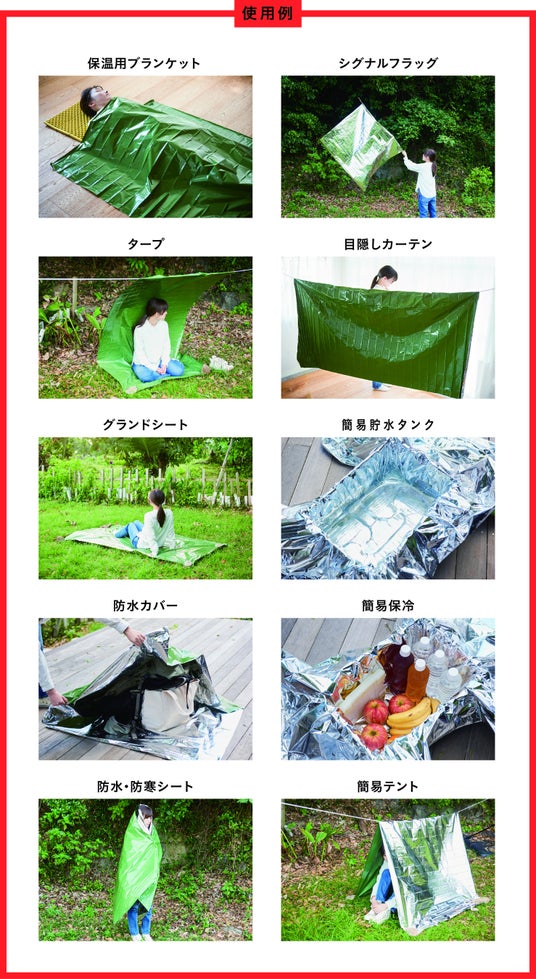 寒さ対策として、防寒シートや保温用ブランケット、突然の雨対策に雨具や防水カバー、グランドシートとしても活用できます。付属のマジックテープを使ってタープや簡易テント、目隠しカーテン、シグナルフラッグとしても利用可能です。他にも簡易貯水タンクや簡易保冷ボックスとしても使用できます。再開封しやすいジッパー付きパッケージで再利用も可能です。使用後は、袋に入る幅のサイズでくるくると巻き、空気を抜くように折りたたんで袋に戻せます。軽量・コンパクトで持ち運びしやすく、災害時だけでなくキャンプ、登山、スポーツ観戦、フェスなど、普段使いのアウトドアにも活用できる優れたアイテムです。
