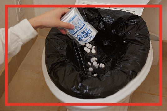 トイレの便座と便器の間にビニール袋を挟み、災害用トイレ処理剤を先に入れて用を足します。