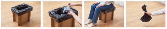 同梱の携帯用トイレは黒のビニール袋と、袋内に入れる排泄物を凝固させ、雑菌を除菌、悪臭を分解できる災害用トイレ処理剤タブレットが入っています。座面にビニール袋を被せ、タブレットを入れれば準備完了。使用後は袋の口を縛って一般ごみとして処理できます。