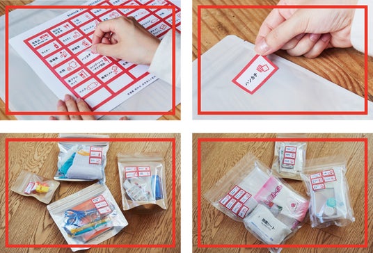 何をどれだけ準備したか、他に必要なものはあるか?など、災害に対する準備とシミュレーションが行えることで、防災の意識が高まります。同封しているシールの項目を参考にしつつ、袋に詰めていく作業を通して、それぞれの家族に必要なものを話し合う機会もつくれます。