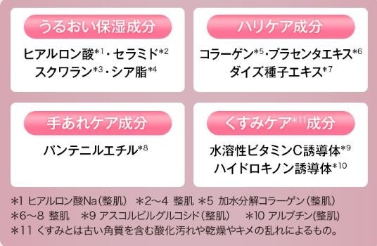 POINT 1 :ハンドパック処方で美容成分を閉じ込めて浸透*²ケア美容液にも使われる美容成分と手あれ防止成分を配合。ハンドパック処方で成分がしっかり浸透*²されるよう開発されています。年齢による手の悩みをケアしてハリのあるなめらかな手に導きます。
