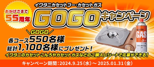 岩谷産業株式会社(本社:大阪・東京、社長:間島 寬)は、イワタニカセットフー※およびイワタニカセットガスの発売55周年を記念し、「おかげさまで55周年 イワタニカセットフー・カセットガス GOGOキャンペーン」を9月25日(水)より開始いたします。本キャンペーンでは、イワタニカセットガスおよびカセットこんろなどの対象商品をご購入いただいた方の中から、抽選で1,100名様に賞品が当たります。賞品は対象商品のご購入金額に応じて、以下の2コースをご用意しています。