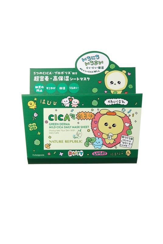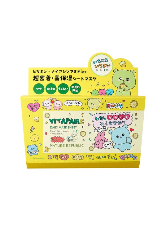韓国発の自然派スキンケアブランド ネイチャーリパブリックと、韓国発キャラクターの「チェゴシム」が初コラボレーション。ネイチャーリパブリックの定番アイテムで、1箱30枚入りで毎日簡単にスペシャルケアを取り入れることをコンセプトとした商品である「デイリーシートマスク」より、肌荒れを防ぎすこやかな肌へと整えるグリーンダーマCICA デイリーシートマスクと、済州島産グリーンレモンを配合したビタペアC デイリーシートマスクの2種類がチェゴシムコラボパッケージで登場します。