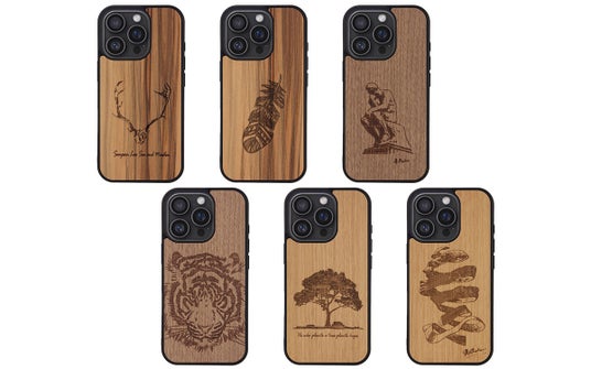 MagSafe対応天然木ケース(左上からウッドディアホーン、ネイティブフェザー、考える人、Tiger、Tree、エッシャーの幻影)