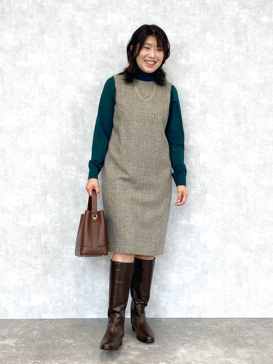 いつものジャンスカコーデも、インナーをグリーンのニットにするだけで、一気に垢抜けて華やかに。色の占める範囲も狭いので、抵抗がある方でも簡単に挑戦できますよ。
