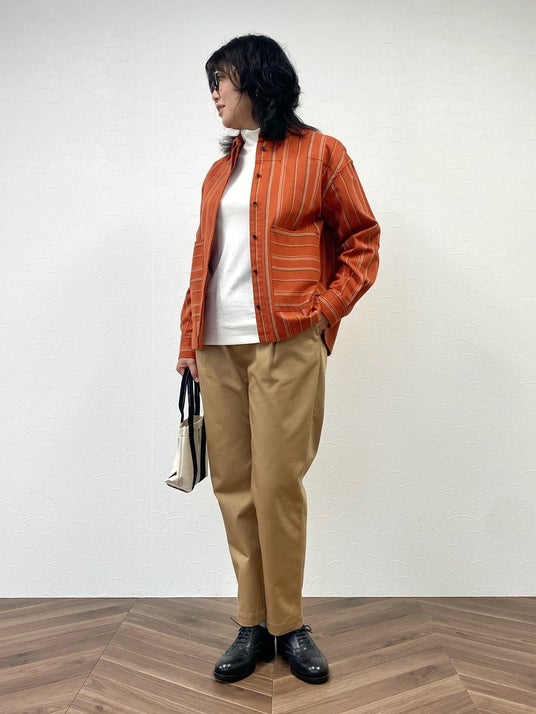 オレンジ×ストライプが着映えするシャツを、体温調整しやすい羽織りアレンジで。インナーとボトムがシンプルでも、羽織るだけで着こなしが一気に決まります。