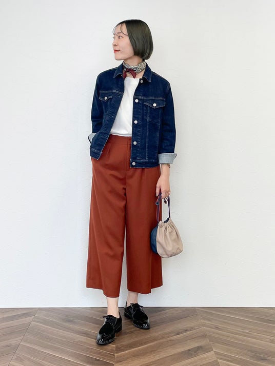 「顔周りにカラーアイテムはちょっと…」な方におすすめなのが、ボトムで取り入れる簡単テクニック。トップスと羽織りをベーシックカラーでまとめれば、落ち着いた雰囲気で楽しめますよ。