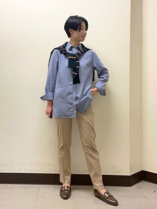通年使えるブルーのシャツは、ベージュのチノパンで秋の雰囲気をプラスしてあげるのがおすすめ。カーデの肩掛けやブラウンのローファーなど、着こなしでより秋仕様にアップデートしてあげると◎。