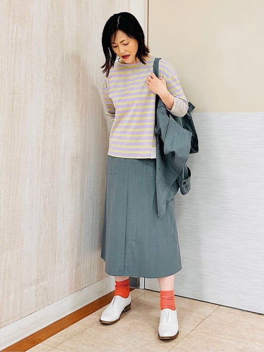 春同様、秋に活躍してくれるボーダーカットソー。ニュアンスのあるパープル×グリーンの配色が、纏うだけで着映えする1枚。汎用性の高い8分袖なので、季節のハザマに重宝しますよ。