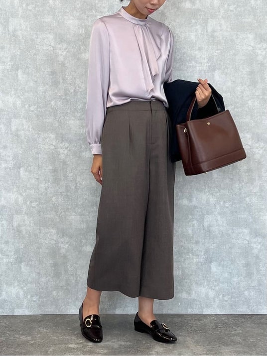 1枚で着映えするフリルブラウス。少々ハードルが高そうで尻込みしてしまいそうになりますが、パープルを選んであげれば、大人は品よく決まります。秋が深まればジャケットインやジャンスカなどとのレイヤードコーデに大活躍!