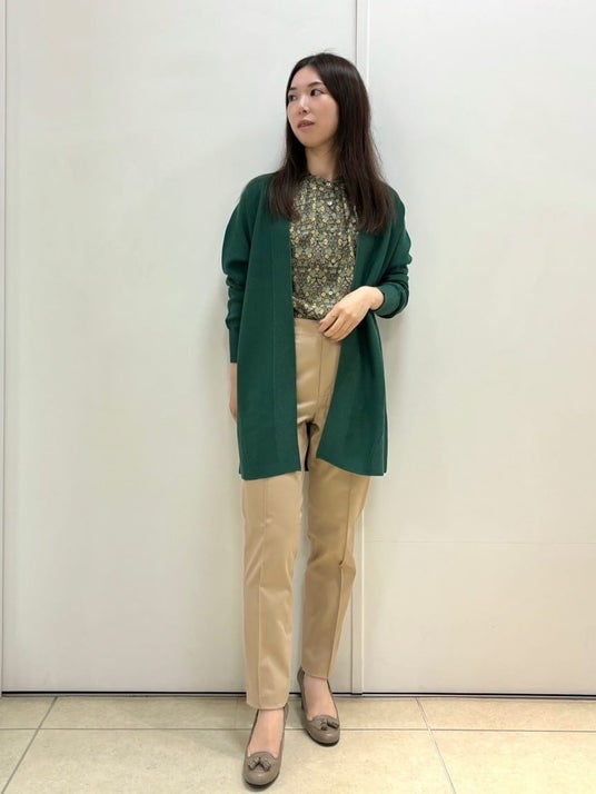 グリーンのリバティプリントブラウスに同系色の着流しカーデを羽織って、ヘルシーで秋らしいブラウスコーデに。ボトムには相性の良いベージュのチノパンでトラッドにまとめました。