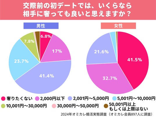 次いで「5,0001~10,000円」との回答が約24%となっており、男性の多くが交際前の初デートでは全額・多めに費用を負担しようと考えているのがわかる結果となりました。