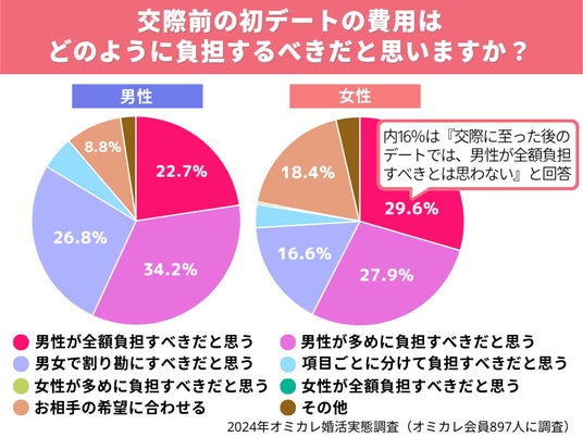 しかし、「男性が全額負担すべき」と回答した女性の16%は、「交際後のデートでは、男性が全額負担すべきとは思わない」と回答しています。