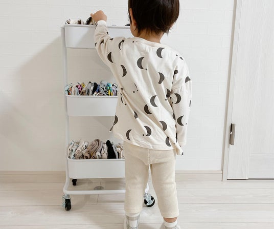 ・今はまだベビーワゴンとしてケア用品をまとめているけれど、来年には娘もオムツ卒業させるのでその後は娘の幼稚園用お支度ワゴンに。その先は子供達のゲームやタブレットをまとめて管理したりに使いたいです。