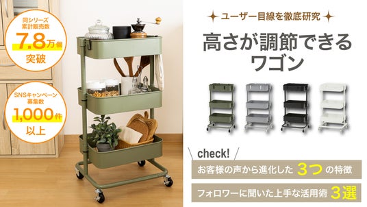 家具およびインテリア雑貨の卸売を行う不二貿易株式会社(本社:福岡県北九州市、代表取締役:田坂 良祐)は2024年9月11日(水)「高さが調節できるワゴン マルシェ」を発売しました。2018年から販売している同シリーズの累計販売数は7万8千個を突破し多くの方にご使用いただいています。キッチン・洗面所など場所を選ばず使うことができ、2022年にInstagramで行ったモニターキャンペーンでも1,000件以上の応募があるなど反響の高い商品ですが「入れたいものとバスケットの高さが微妙に合わない」といった声もいただいておりました。そこでより快適に使っていただくために、バスケットの高さが調節できる新タイプを開発しました。さらに収納を増やすためのフックを付属するなど使う方に寄り添った形になっています。こちらはインターネットや全国のホームセンターなどで販売いたします。