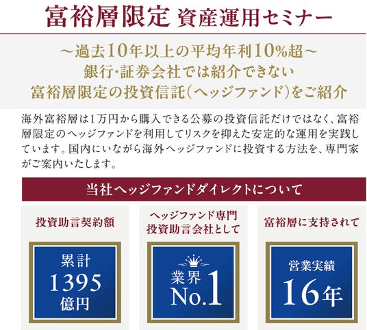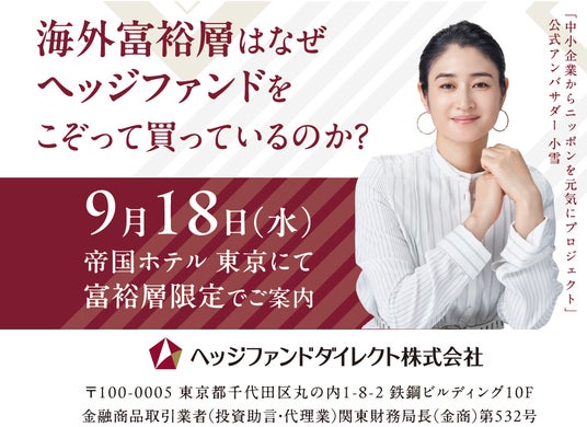 ヘッジファンドダイレクト株式会社(以下当社)は9月18日(水)に、帝国ホテル東京にて、富裕層向け資産運用セミナー『海外富裕層はなぜヘッジファンドをこぞって買っているのか』を開催いたしました。