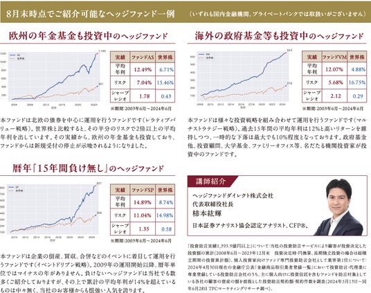セミナー後半では、国内プライベートバンク等では紹介されない、海外機関投資家等も投資中のヘッジファンド事例(いずれも国内からご投資可能)をいくつかご紹介させていただきました。
