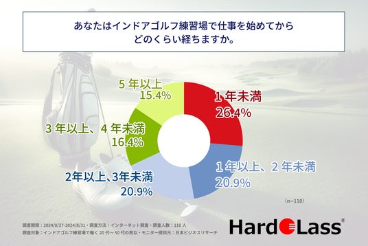 まず、「インドアゴルフ練習場で仕事を始めてどのくらい経つか」を尋ねる設問の回答では1位が「1年未満」で26.4%、2位と3位が同率で「1年以上、2年未満」と「2年以上、3年未満」で20.9%という結果になりました。インドアゴルフ練習場は施設自体が増加傾向にあることもあり、そこで働く方も働き始めてから比較的期間の短い方が多いとわかりました。