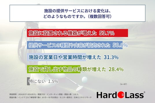 最後に、「インドアゴルフ練習場の仕事に近年変化を感じる」と回答された方に、「施設の提供サービスにおける変化は、どのようなものか」を問う設問の回答では、1位が「施設に設置される機器が増えた」で53.7%、2位が「提供サービスの種類や内容が拡充された」で50.8%、3位が「施設の営業日や営業時間が増えた」で31.3%という結果になりました。ここでは、いずれも施設利用者であるお客様へのサービスを強化するような内容の変化が上位に並ぶ結果となりました。