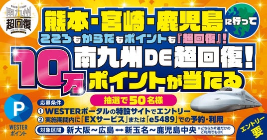 「南九州DE超回復 ~HEALING JOURNEY in 熊本・宮崎・鹿児島~」の開催を記念して、e5489またはEXサービスで対象区間をご利用いただいた方へ、抽選でWESTERポイントをプレゼントする企画を実施します!