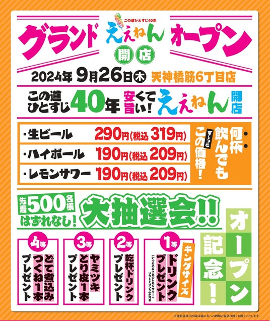 【オープン記念】先着500名様にスピードくじ!ドリンク「キングサイズ」プレゼントなど ”はずれなし” 大抽選会開催!