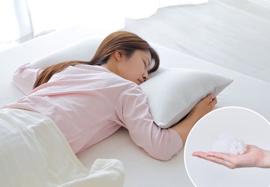 「とにかく低い枕」は、とにかく身体に負担をかけない”健康睡眠”のことを考えて作られた枕です。その名の通り高さが低い枕で、頭部と首元の下にできる隙間を埋め、身体に負担のかからない理想の寝姿勢を維持するのに必要なだけの高さで作られています。また、枕に使用される様々な素材の中でも柔らかいといわれる粒状のわた素材を使用することで、ふんわりと優しい寝心地を実現しました。