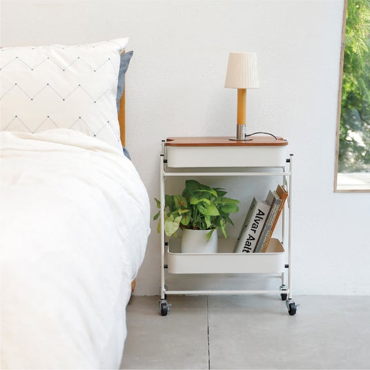 ベッドサイドに置けば照明を載せたり、ティッシュケースなど生活感のあるものは
