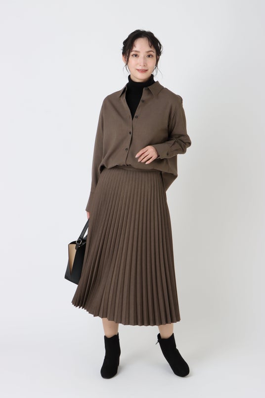 歩く度に裾がきれいに揺れ動くプリーツデザインは、シンプルなトップスを合わせても華やかな印象になります。また、丈はビジネスシーンでも使いやすくトレンドのショートブーツとの相性も良い、長すぎない丈に設計しました。