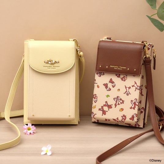 サマンサタバサプチチョイスのロングセラーアイテム、スマホショルダーは「チップ&デール」は総柄アートデザイン、「クラリス」は折財布と同じオリジナル金具デザインの2種類が登場。
