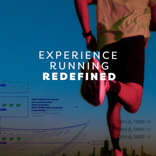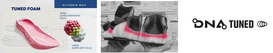 「DNA Tuned」は「DNA LOFT」フォームを用いた次世代の窒素注入フォームで、2段階の射出成形と超臨界発泡技術により誕生しました。この技術によって、かかと部には接地時の衝撃を吸収する大きな気泡、前足部には力強い蹴り出しをサポートする小さな気泡が多く含まれています。単一のフォームで成形され、耐久性、快適性、そしてパフォーマンスを損なうことなく、ソフトで高い反発性を実現しました。