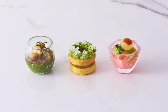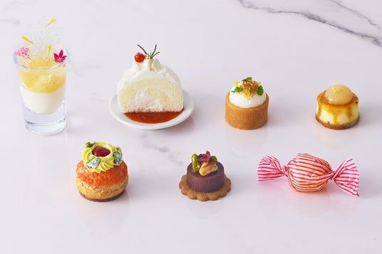 金平糖や水飴など様々な形の飴を使用したものや、あめちゃんの形に見立てた全10種類のスイーツとセイボリーを提供します。たとえば、金平糖をトッピングした「ロールケーキ」や、飴がけナッツを使用した「ショコラタルト」、トマトやブロッコリーを中に入れ野菜のコンソメとアガー(*3)で丸いあめちゃんの形に仕立てた「あめちゃんサラダ」など、あめちゃんとクリスマスらしさを融合したメニューを楽しめます。クリスマスらしさを味わえることはもちろん、スイーツとセイボリーに散りばめられた飴の要素に思わず会話も弾みます。