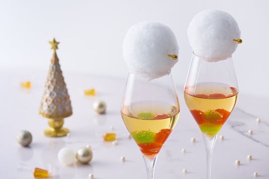 アフタヌーンティーの始まりには、ウェルカムドリンクとして真ん丸なキャンディに見立てた氷と綿飴で彩った「あめちゃんスパークリング」を提供します。シロップで色付けした氷は赤と緑でクリスマスカラーを、グラスのふちに付いた砂糖は雪をイメージしています。柑橘系の香りが特徴のスパークリングワインに綿あめを溶かしながら味わうことで、風味の変化も楽しめます。また、ノンアルコールドリンクとして「あめちゃん白ぶどうスパークリング」も用意しており、お酒が苦手な方も安心して楽しめます。