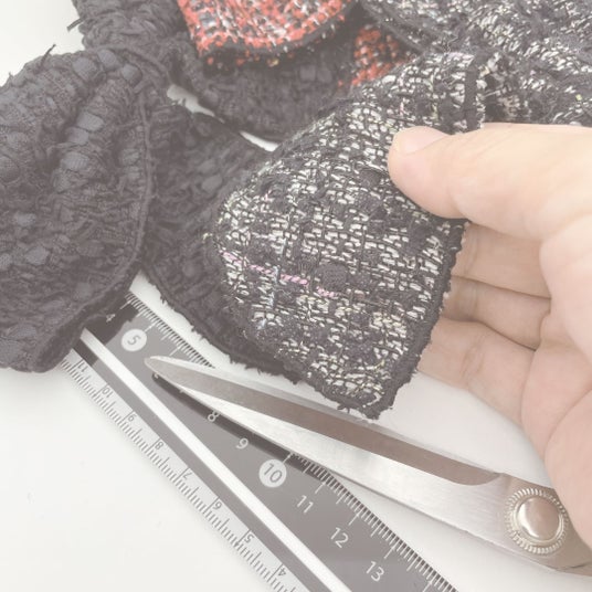 オールブラックなのに太さの違う糸の重なりが立体感を生み、織り目の光沢と大胆なほつれがアクセントのブラックツイード。カチッとクールなジャケットスタイルからブラックタートルネックのニットなどモードにつけるのがおすすめ。ゴールドやローズゴールドのヘアアクセサリーとコーディネートするとラグジュアリー感がアップします。