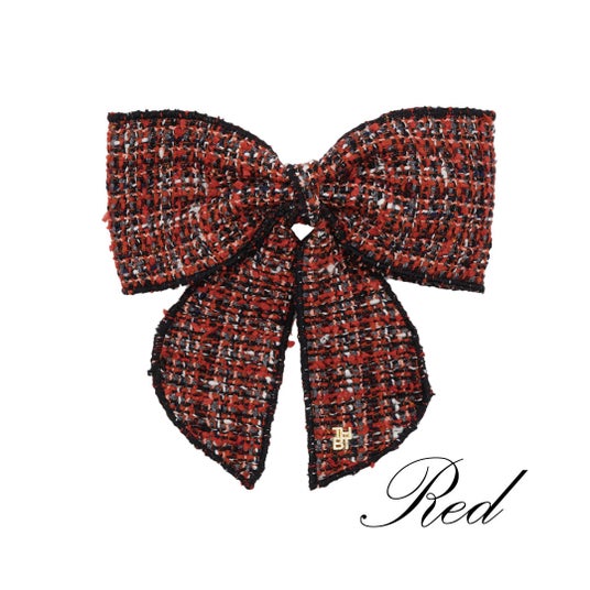 レッド、ホワイト、オレンジ、ブラックなど様々なカラー、種類の糸が重なったモダンクラシカルな織りのツイード。ブラックやホワイトのシンプルなコーディネートファッションのポイントにぴったり。ゴールドのヘアアクセサリーとの相性も抜群なので、異素材のアイテムとのコーディネートも楽しめるREDです。