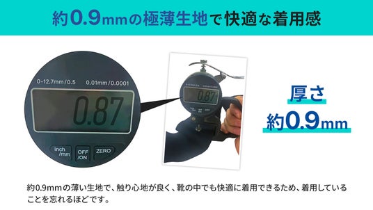 伸縮性に富んだ約0.9mmの極薄生地で、肌触りが良く、靴の中に着用していても、着用していることを忘れるほどの快適さを実現。