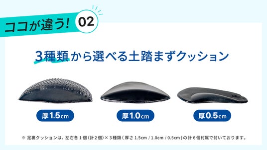 足裏アーチの状態や、着用する靴の種類に合わせて、3種類のクッション(0.5cm/1.0cm/1.5cm)から高さを選べるアジャストクッション機能付き。ジャストフィットするクッションで、理想的な足裏アーチ形成をサポートします。