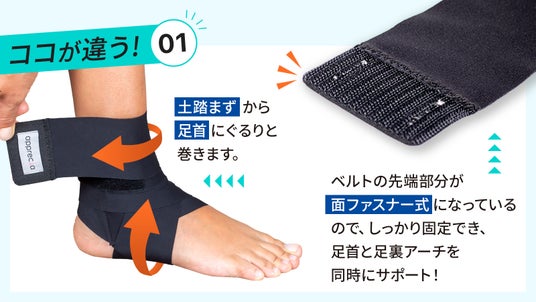 筒状の部分に足を通し、土踏まずから足首にぐるりと巻くだけで、身体のバランスをサポート。運動やトレーニングの際に、効率良く身体を動かすことができます。また、ベルトの先端部分が面ファスナー式になっているので、足首と足裏アーチを同時にサポートします。