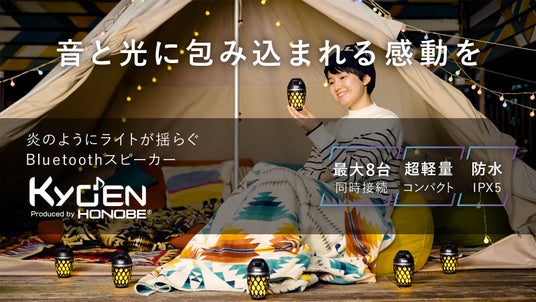 炎が揺らめくような美しいLEDランタンと、優しい音に包まれるBluetoothスピーカーが一つになった「KYOEN (響炎)」。その名は音楽の「協演」からインスピレーションを得ている。