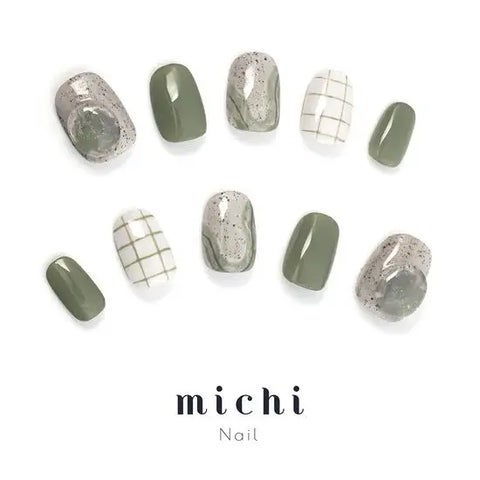 くすみグリーンと、グレーで暗くなりすぎない柔らかな印象のニュアンスネイルに仕上げました。