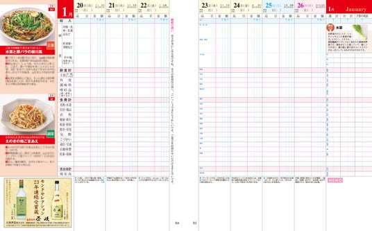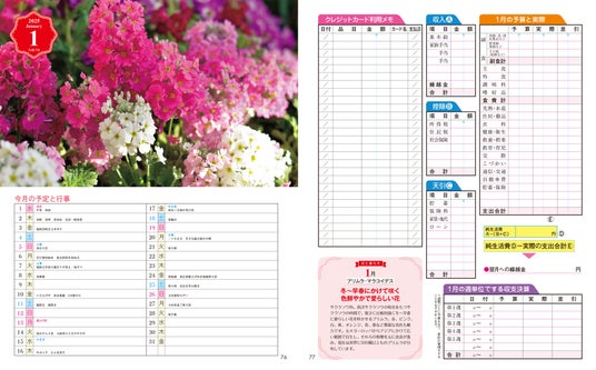 給料日決算、月末決算でも自由に記帳できるので便利です。お花の写真と料理レシピも掲載していて、楽しく続けられます。毎日の家計簿のメモ欄に日記が書けるのも好評です。領収書ポケット、ナチュラルフラワーカレンダーの付録もついています。