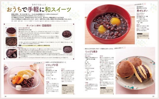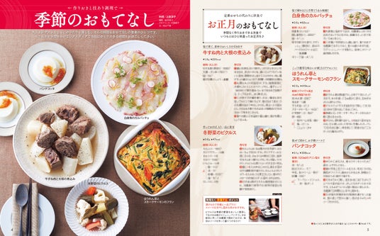 また、巻頭特集2、3では人気料理研究家・本田明子さんの「野菜のストックで簡単おかず」、「おうちで手軽に和スイーツ」のレシピを紹介しています。ほかに、素材別毎日のおかず、人気料理研究家・きじまりゅうたさん、脇雅世さんの1月~12月おすすめ献立おかずなど、300品以上の料理レシピを掲載。毎日のおかず作りに役立ちます。コラムや食材メモも充実。