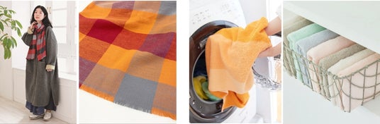 (左)ソフトな生地感のコットンマフラー (右)色落ち・色あせ・変色を防ぐ綺麗長持ちシリーズタオル
