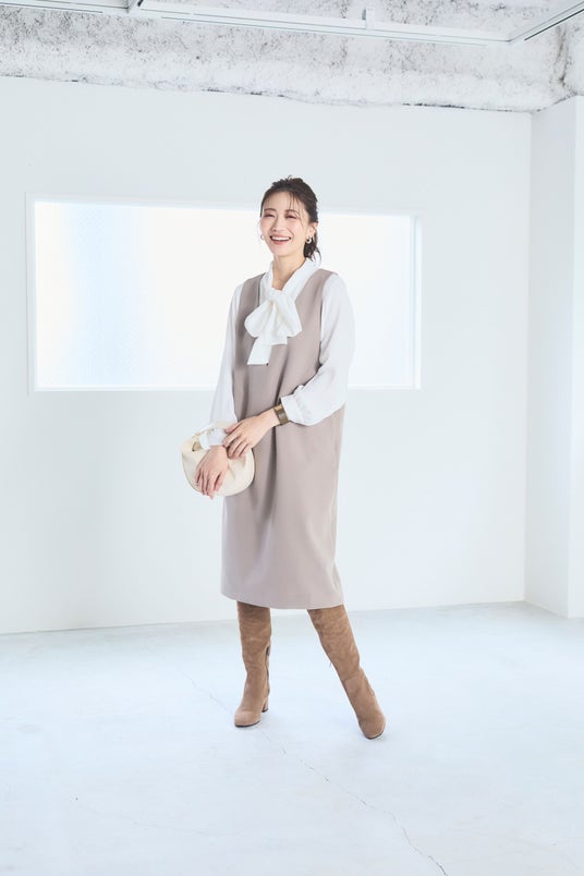 深いVネックが抜け感をもたらす大人可愛いジャンパースカート