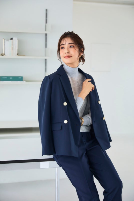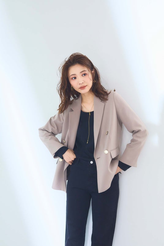 マットなゴールドボタンが大人顔のダブルテーラードジャケット。